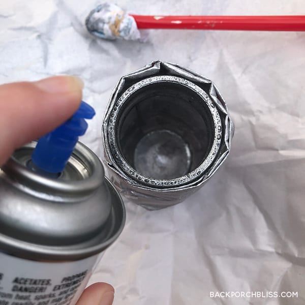 Shake your spray paint as directed on the can and spray very lightly into the inside of the jar. You’re going to do this in layers.