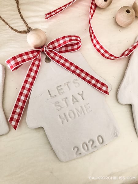 I have been wanting to learn how to make these simple, clay Christmas ornaments for a while, and recently was inspired by a DIY video from my friends at 2BeesInaPod.com. And with a year like 2020, I decided to go with the ‘Let’s Stay Home’ theme, just like my cookies last week. I started this project with the goal of making a garland for my mantel using twine, but it just wasn’t working for me.