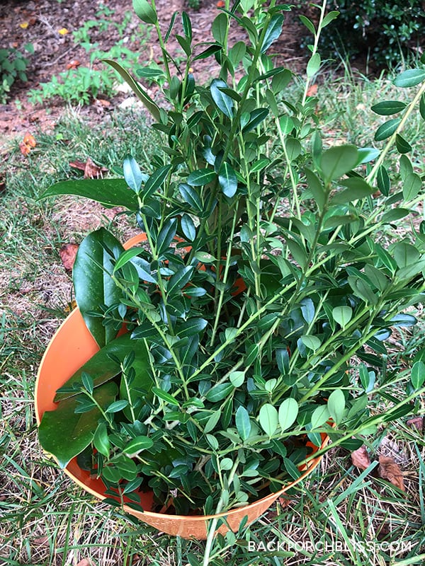 Next, I took small bunches of boxwood and went around the wreath, tying with floral wire. I was fine with some of the branches sticking out for a more natural look.