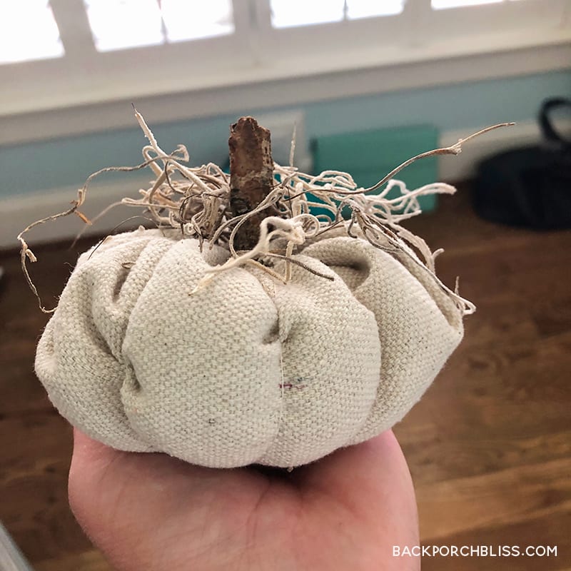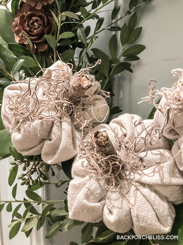 Lastly, I added in my pine cone rosettes and a few drop cloth pumpkins, held in place with hot glue. I like spreading out the decorative elements in bunches of twos and threes.