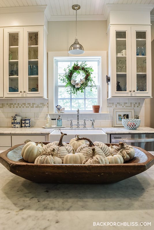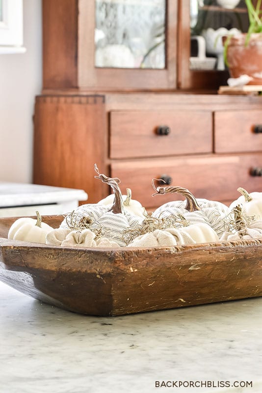 I added a few of my drop cloth pumpkins in an antique dough bowl for a Fall farmhouse look.