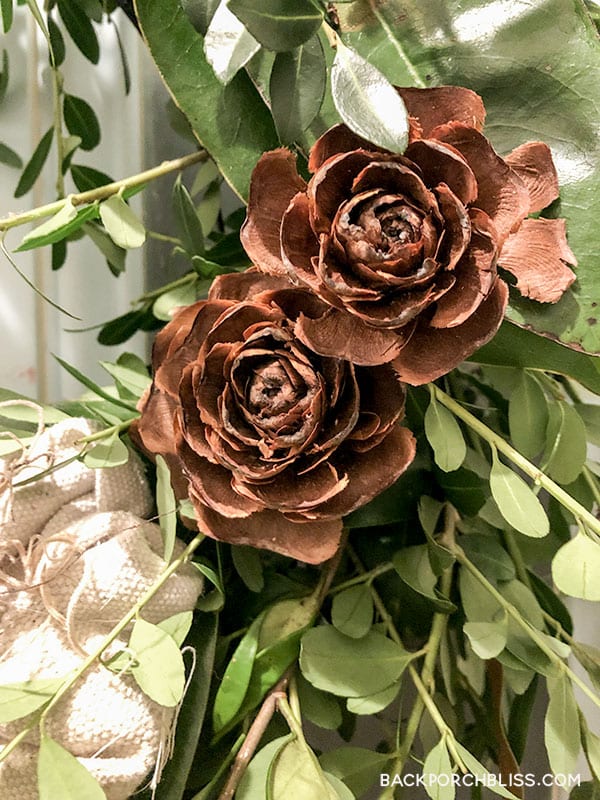 First, I clipped magnolia leaves, boxwood and tea olive branches from my yard. Earlier this year, I collected cedar rose pinecones just waiting for the right project.