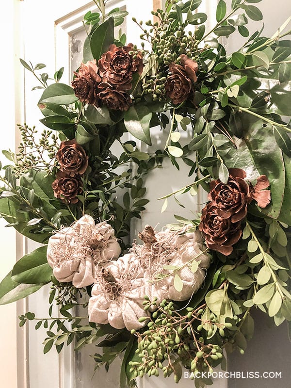 My natural drop cloth pumpkin wreath is now hanging in the kitchen window. We’ll see how long it lasts. Maybe next time I’ll try drying the greenery first.