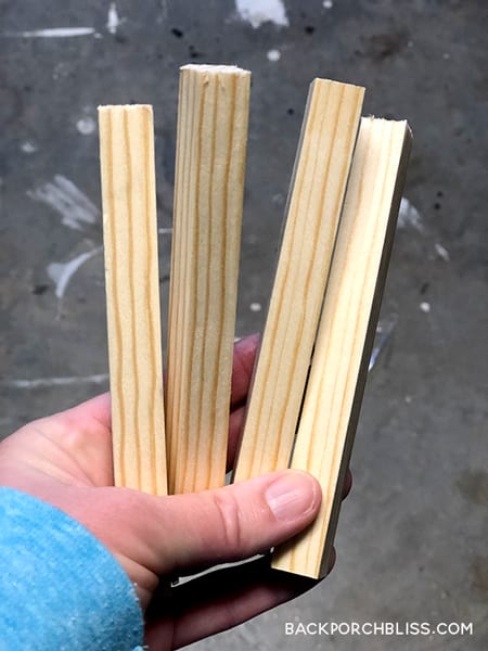 First, cut your dowel into (4) 5″ pieces. If you don’t have a saw, ask the hardware store to do this for you or use a handsaw.